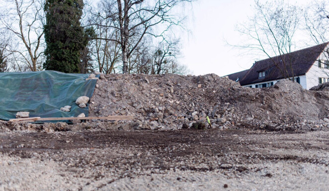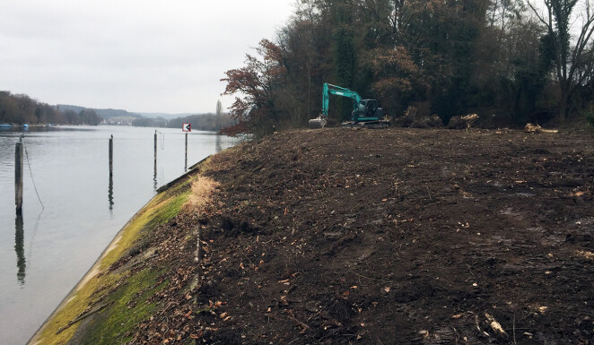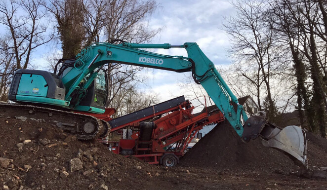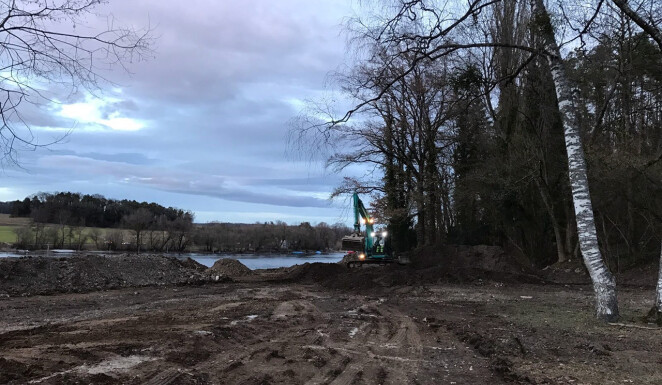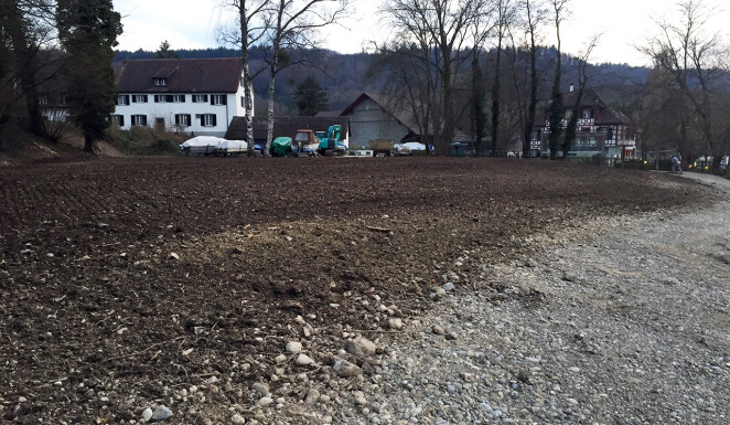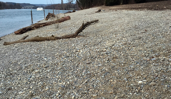 Im Winterhalbjahr 2016/17 durften wir bei Schlatt TG einen Abschnitt des Rheinufers renaturieren. Nach Entfernung, Zerkleinerung und Entsorgung der Betonplatten, wurde das Erdmaterial entlang des Ufers abgetragen. Da dieses mit Beton und Ziegelsteine kontaminiert war, musste es zuerst mit einer Siebmaschine aufbereitet werden, sodass das ausgesonderte Material in einer Deponie fachgerecht entsorgt werden konnte. Der aufbereitete Ober- und Unterboden konnte so anschließend wiederverwendet und eingebaut werden. Das Flussufer wurde flacher gestaltet und mit Wandkies sowie Schwemmholz zur Umgebung passend modeliert.